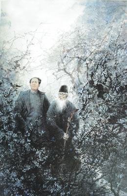 郭老双手一拍,“妙哉妙哉!画上果然署有主席的大名!”白石老人却被闷进了葫芦罐儿:“李树画的很茂盛,怎么会是主席的名字呢?请郭老代为解释。”“好。”郭老说:“红军决定撤离延安时,主席面对将要离开的延安说,离开者,得胜也。于是主席就取了另一台甫——李(离)得胜,后来果然得胜。所以主席对这一姓名十分喜爱。”“噢……怪不得主席的两位千金取名李敏、李讷呀。”白石老人明白了,也乐了:“如此说来,拙画还有点意思。那么,劳驾二位在卷首上赏赐几个字,如何?”郭老说:“我听主席的。”主席说:“我听画家的。”白石老人一抱双拳:“多谢多谢!”