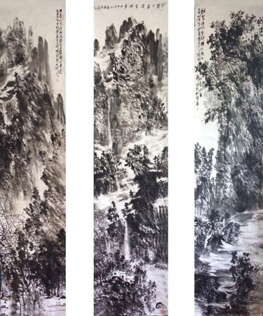 在那面安装了磁铁板的墙面上,林干先生取出数幅山水花鸟作品,挂上。但见草木葱郁,流水潺潺,层层掩映,莽莽苍苍,而构图奇满。构图虽满,却远近浓淡分明,虚实相生,绝无逼仄拥堵之感。画面顶上的一行落款和衿印,透出一股浓郁的文人画气息。他的很多山水画的画面场景,仿佛似曾相识,我甚至能说出这是什么地方,他笑道,江山无处不入画,只要其趣天成,又何必大川名山?!他是善于观察并抓住精神的,所谓道法自然吧。 林干先生的花鸟画,一如他的性情,充满雄豪阳刚的气息,焕发着勃勃生机,看了令人振奋。他的花鸟,有山水画的情趣和大气;他的山水,有花鸟画的豪迈率真,一气呵成。有的画,饱满得振纸欲裂,中间枝条穿插得密不透风,却能做到繁而不乱,来龙去脉都笔笔交待得一清二楚,气脉贯通。他的题款,往往有点睛之效,看似随意的位置,却是恰到好处的。他的画,就是他性情的外露,是他才情的凝聚,活脱脱一个笔墨中的自己,这就是所谓的风格吧。 惊觉时间不早,向他辞行的时候,已是子夜。不知不觉间,我已迷醉在他的书画世界里三个多小时。我不会画,不敢画,但喜欢看别人作画,喜欢欣赏有精神内涵和笔墨情趣的画作。这有点象中国球迷,自己不踢球,但并不妨碍他们成为铁杆球迷,并乐在其中。 艺术是相通的。真正好的作品不需要解释,自会震撼人的心灵,让人得到美的享受。林干先生的作品,我读得懂,很喜欢;林干先生 这个人,我同样很喜欢,值得相交。 秋夜晚风萧瑟,内心却很温暖。宁海这个地方,总是时不时地会孕育出几个不同凡响的人物。如潘天寿先生,便是一个不折不扣的艺术天才。我看到过潘先生二十来岁时的画作,那可真是天惊地怪,很少有人敢这么画的。可他就这么画了,画出了不凡的成就,画出了宁海人的风采,画出了美术史上辉煌的一笔。我不敢也不会拿林干先生同潘先生作比。我想要说的是,他们都是画画的人,都是对艺术有着自己见解和追求的人,都是有着宁海人风骨的文人。不同的是,潘先生二十几岁时就走出去了,林干先生六十开外却很少离开宁海。 前文提到过,走出宁海的宁海人才可能成名成家,蜗居小城往往籍籍无名,终老一生。林干先生不是不懂得这条宁海人的“铁律”,只是表现得无动于衷。淡泊宁静,于艺事之外的一切都看得很淡,喜欢画画的原因就是因为喜欢,几乎不考虑画能带给人的名利,不屑于世故圆滑和公关传播,不乐于经营自己,这就是宁海文人的典型性格。这样的风骨,看来在林干先生身上也有所传承。他的身心,并没有被商品经济的滚滚大潮湮没或薰染,仍能保持自己的率真和幽淡,这是很难得的。 也许有一天,这个人渐渐地会被世人接受和了解,以至欣赏和崇拜。即使如此,我仍相信:这不会是他的本意,也不会是他的刻意,而是水到渠成,实至名归。 我期待有这么一天,我也相信,应该会有这样的一天。